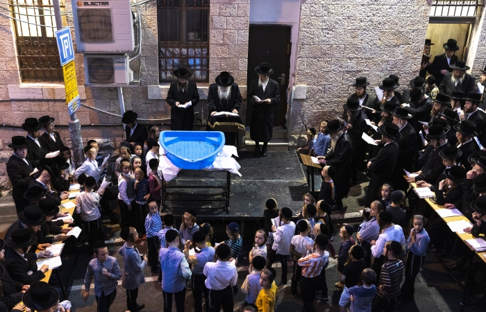 Cérémonie traditionnelle du »Malkot » dans une synagogue du quartier ultra orthodoxes de Mea Shearim, à Jérusalem, le 27 septembre 2020. © Yonatan Sindel/Flash90