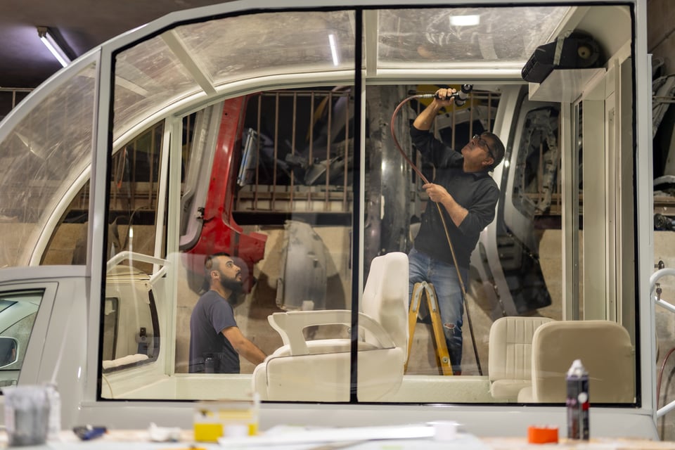 Nouveau look pour une nouvelle vie. Des vitres ferment désormais l’arrière de la voiturette, un siège de consultation et des petits réfrigérateurs et tout le système d’amortissage renforcé : après quelques mois de labeur, la papamobile de Bethléem a été transformée en « véhicule de l’espoir ».