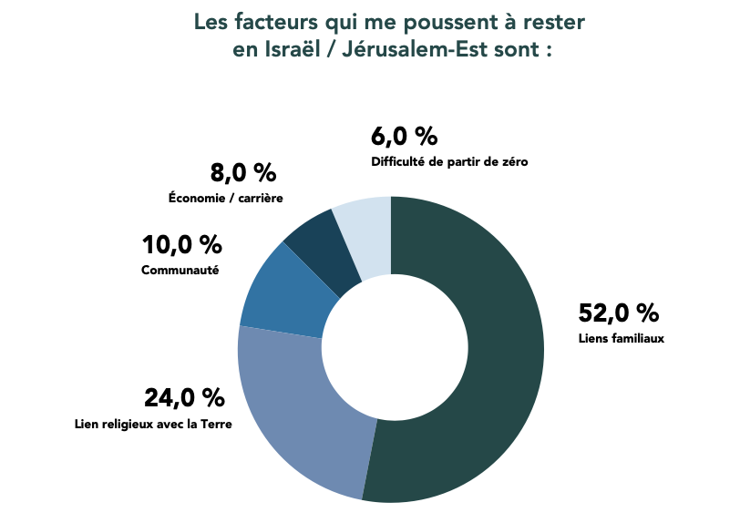 « Le nombre de personnes tuées dans des incidents criminels a doublé depuis 2022 », note le rapport. À Jérusalem, la chape de tensions politiques et religieuses renforce ce désir d’ailleurs. Pourtant, près des deux-tiers des répondants (64%) affirment vouloir rester, invoquant la famille (54 %) et le lien à la terre (24%).
