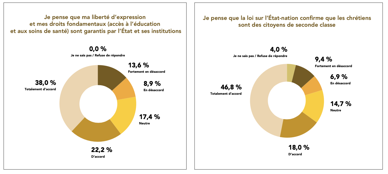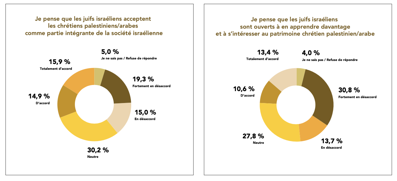 En filigrane, l’étude révèle le sentiment d’une double marginalisation: minorité religieuse au sein du monde arabe palestinien, minorité nationale au sein de l’État d’Israël. À peine trois chrétiens sur dix disent se sentir pleinement acceptés dans la société israélienne. À Jérusalem-Est, où beaucoup ne disposent pas de la citoyenneté israélienne, plus de la moitié (54%) affirment subir rejet ou exclusion.